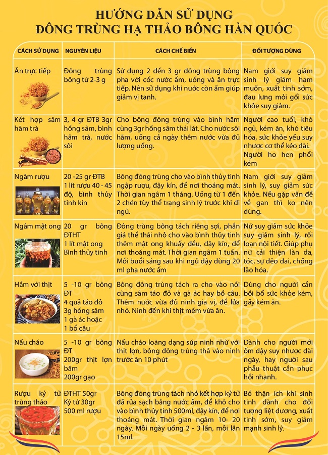 5. Bông Đông trùng hạ thảo ngâm rượu: Bông đông trùng hạ thảo để nguyên cọng ngâm rượu nồng độ cao. Ngâm trong vòng tối thiểu 3 tháng. Sau đó, mỗi ngày uống 1 chung 50ml.