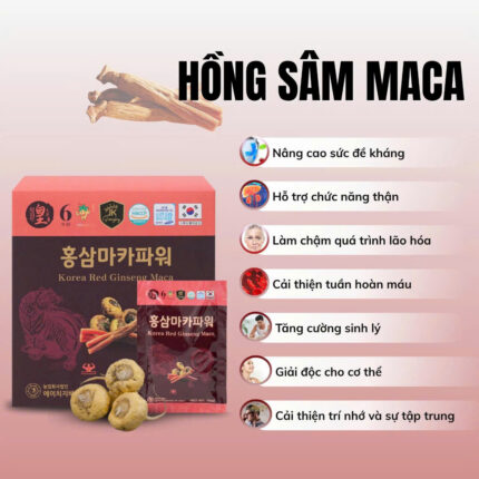 ⭐️ Nước Chiết Xuất Hồng Sâm Maca NH Bio Hộp 20 Gói x 70ml là sản phẩm được bào chế, chiết xuất và sản xuất thành phẩm từ 2 nguồn nguyên liệu chính là nhân sâm Hàn Quốc 6 năm tuổi và củ maca (hay còn gọi là nhân sâm Peru), có bổ sung thêm một số thành phần thảo dược khác có lợi cho sức khỏe người sử dụng với liều lượng vừa đủ, theo một công thức đặc biệt.