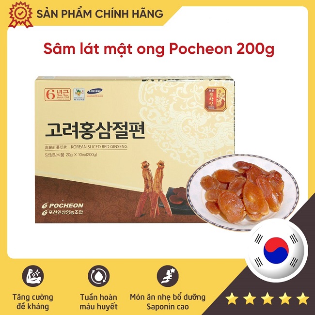 ⭐️ Hồng Sâm Lát Tẩm Mật Ong Pocheon là một trong những sản phẩm cao cấp của Pocheon được sản xuất từ nguồn nguyên liệu chính là Nhân Sâm Hàn Quốc 6 năm tuổi, trải qua một quá trình chế biến bằng phương pháp hấp cách thuỷ công phu, phức tạp trên dây chuyền công nghệ hiện đại, sau đó, được tẩm mật ong rừng nguyên chất. Đây là sản phẩm dùng để bổ cơ thể, tăng cường sức khỏe, sức đề kháng một cách hiệu quả, phù hợp cho mọi đối tượng sử dụng. Đặc biệt là những người lớn tuổi, sức khoẻ suy giảm, những người đang trong thời kỳ hồi phục sức khoẻ sau bệnh tật.