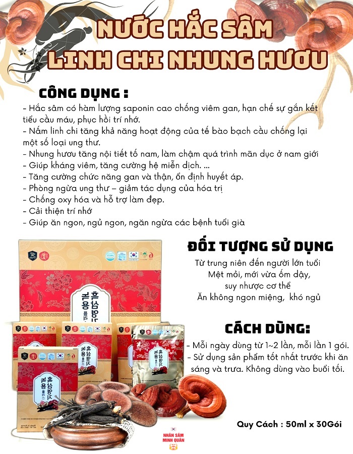 {hàm lượng rắn 2.2%, hồng sâm 4%}, mật ong], chiết xuất nhung hươu 0.1% [hàm lượng rắn 0.1%, nước tinh khiết, nhung hươu 0.3%], nấm linh chi cô đặc 0.1% [hàm lượng rắn 60%], hắc sâm cô đặc 0.1% [hàm lượng rắn 60%], hương liệu tổng hợp (hương thảo mộc), chất điều chỉnh độ acid (citric acid), vitamin C.