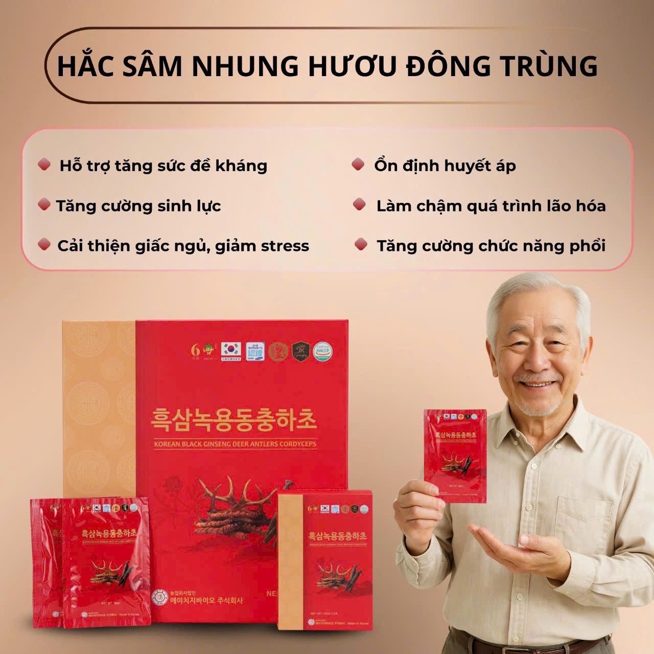 ✅ Nước Chiết Xuất Hắc Sâm Nhung Hươu Đông Trùng Hạ Thảo HG Bio Hộp 30 Gói x 50ml là sản phẩm được chiết xuất từ 3 nguồn nguyên liệu chính là hắc sâm Hàn Quốc thượng hạng, đông trùng hạ thảo Militaris chất lượng cao và nhung hươu New Zealand, lại được bổ sung thêm hồng sâm và một số thành phần thảo dược khác nên mang lại nhiều công dụng rất tốt đối với sức khỏe của người sử dụng. Các thành phần nguyên liệu của sản phẩm đã được chuyên gia cân đo tỉ mỉ với liều lượng phù hợp và tất cả được đưa qua một chu trình chiết xuất khép kín nhằm phát huy tối đa công dụng của hắc sâm, nhung hươu và đông trùng hạ thảo. Đây cũng là một trong các sản phẩm chiến lược của Nhà sản xuất HG Bio Co., Ltd., đã và đang được tiêu thụ tại nhiều quốc gia như: Hàn Quốc, Trung Quốc, Mỹ, Anh, Đài Loan, Việt Nam…