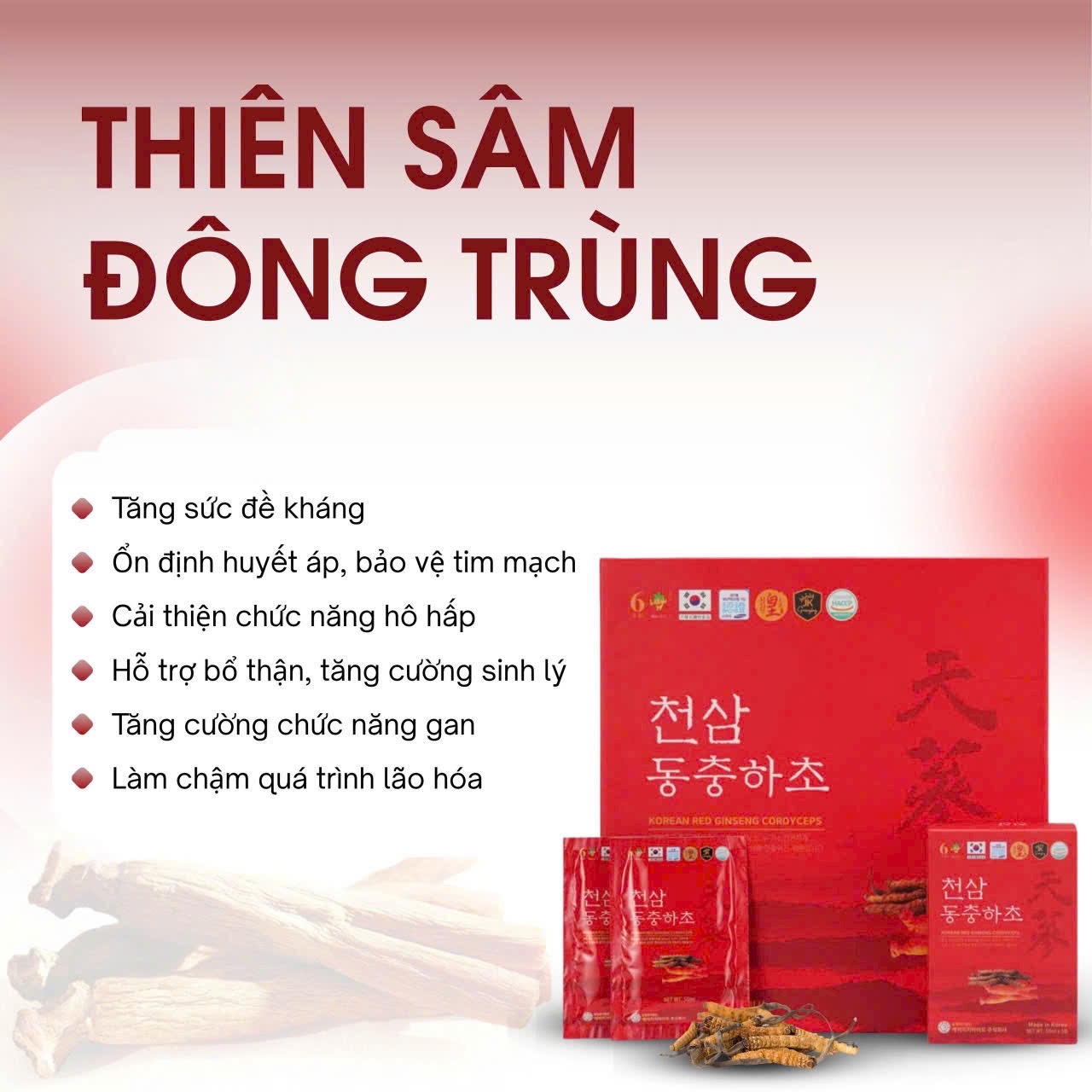 ✅ Dưới sự giám sát của các chuyên gia hàng đầu trong ngành nhân sâm của Hàn Quốc, cộng với dây chuyền sản xuất hiện đại của NH Bio Co., Ltd., sản phẩm đã được được nghiên cứu, bào chế và sản xuất thương mại dựa trên sự kết hợp giữa Hồng Sâm 6 năm tuổi và Đông Trùng Hạ Thảo, lại được bổ sung thêm một số thành phần thảo mộc khác có lợi cho sức khỏe nên mang hương thơm đặc trưng của nhân sâm cùng thảo mộc, cộng với vị béo bùi đặc trưng của đông trùng hạ thảo.