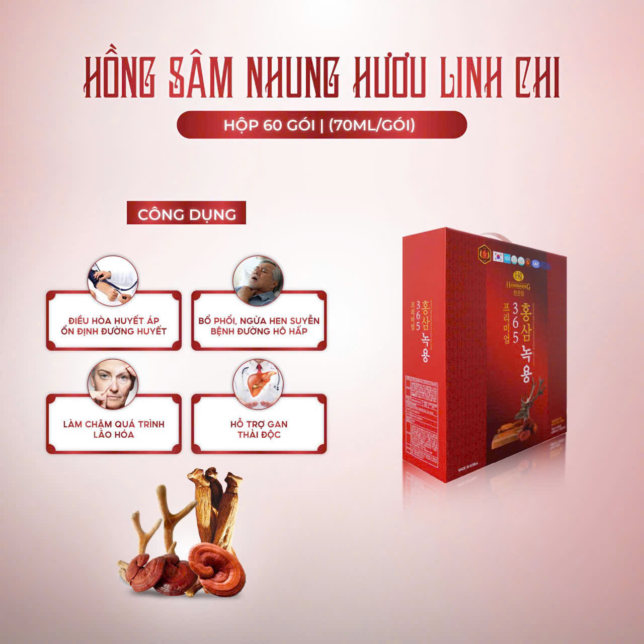 Nước Chiết Xuất Hồng Sâm Nhung Hươu Linh Chi 365 Hàn Quốc Hộp 60 Gói x 70ml – Bồi bổ sức khỏe, phòng ngừa bệnh tật: