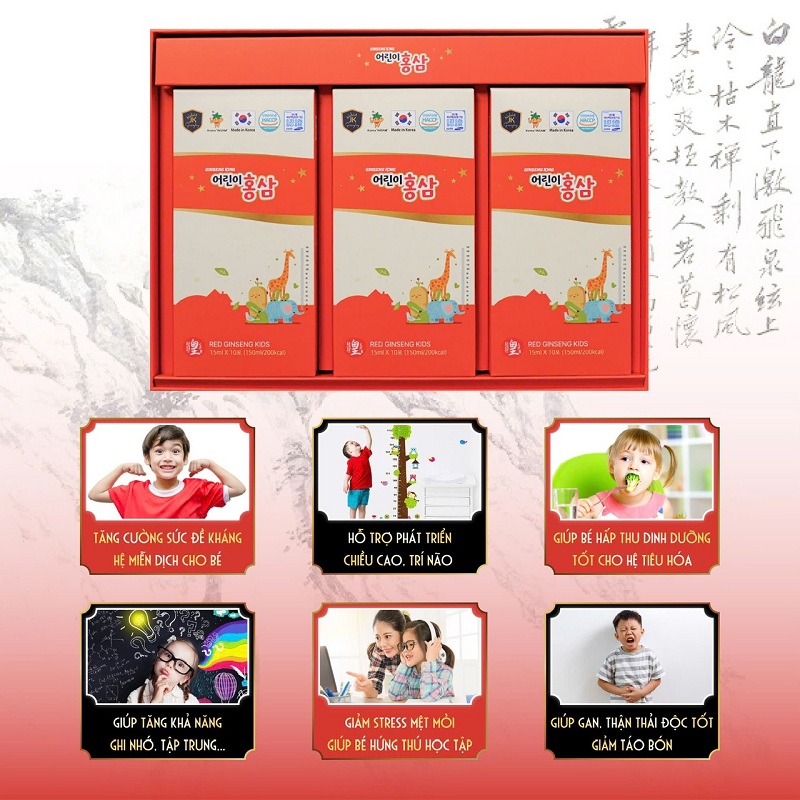 ⭐️ Sự kết hợp giữa tinh chất hồng sâm với các thành phần thảo mộc khác, đã được điều chỉnh hàm lượng phù hợp với thể trạng lứa tuổi của trẻ nhỏ, có bổ sung thêm nước ép hoa quả với mùi hương quyến rũ và đặc biệt thơm ngon. Sử dụng sản phẩm đều đặn và đúng cách giúp tăng cường chức năng cho hệ thống tiêu hóa, dạ dày và gan, kéo giảm mụn nhọt và trứng cá, cải thiện thể trạng cho trẻ lười ăn, chậm lớn, còi xương, suy dinh dưỡng và hay ốm vặt, chống lại các bệnh đường hô hấp do virus, hỗ trợ tăng cường hệ miễn dịch cho trẻ hữu hiệu.