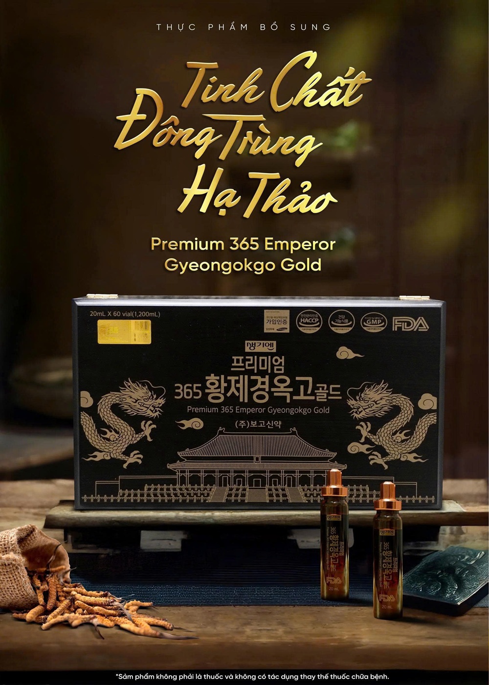 Nước Tinh Chất Đông Trùng Hạ Thảo Premium 365 Emperor Gyeongokgo Gold Hộp Gỗ 60 Ống x 20ml