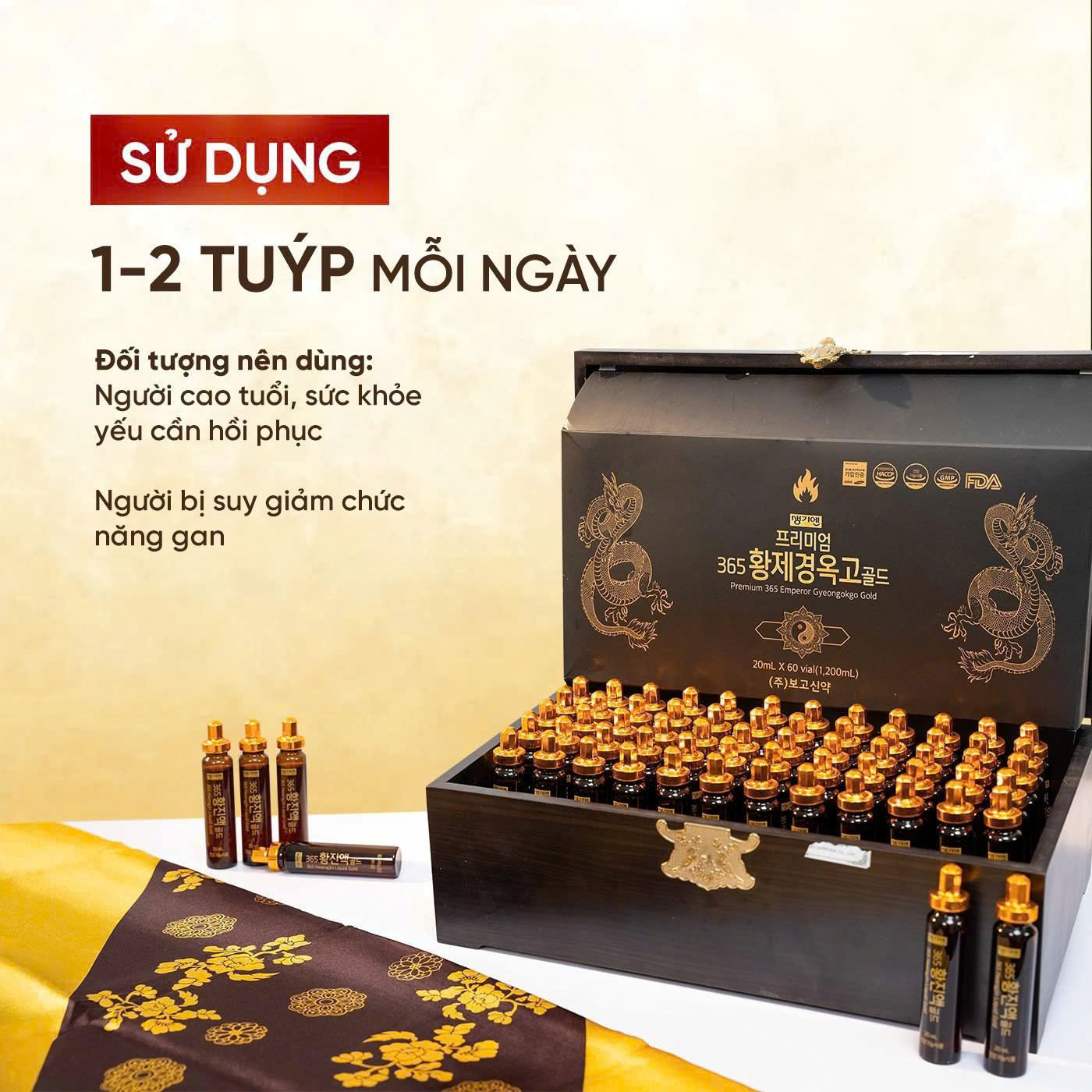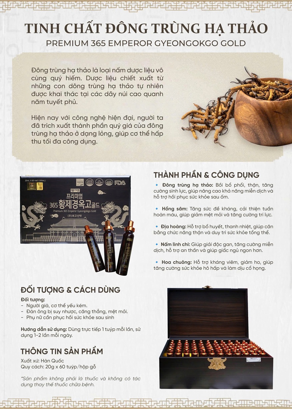 ✅ Nước Tinh Chất Đông Trùng Hạ Thảo Premium 365 Emperor Gyeongokgo Gold Hộp Gỗ 60 Ống x 20ml là hỗn hợp lỏng, được chiết xuất từ 2 nguồn nguyên liệu chính là đông trùng hạ thảo tự nhiên và nhân sâm Hàn Quốc. Bên cạnh đó, sản phẩm còn được có bổ sung thêm một số loại thảo dược quý hiếm khác với liều lượng nhất định theo một công thức đặc biệt, rất tốt cho sức khỏe người sử dụng. Sản phẩm được đóng gói dạng ống thủy tinh hợp vệ sinh và được sản xuất trên dây chuyền hiện đại, đảm bảo tiêu chuẩn an toàn thực phẩm.