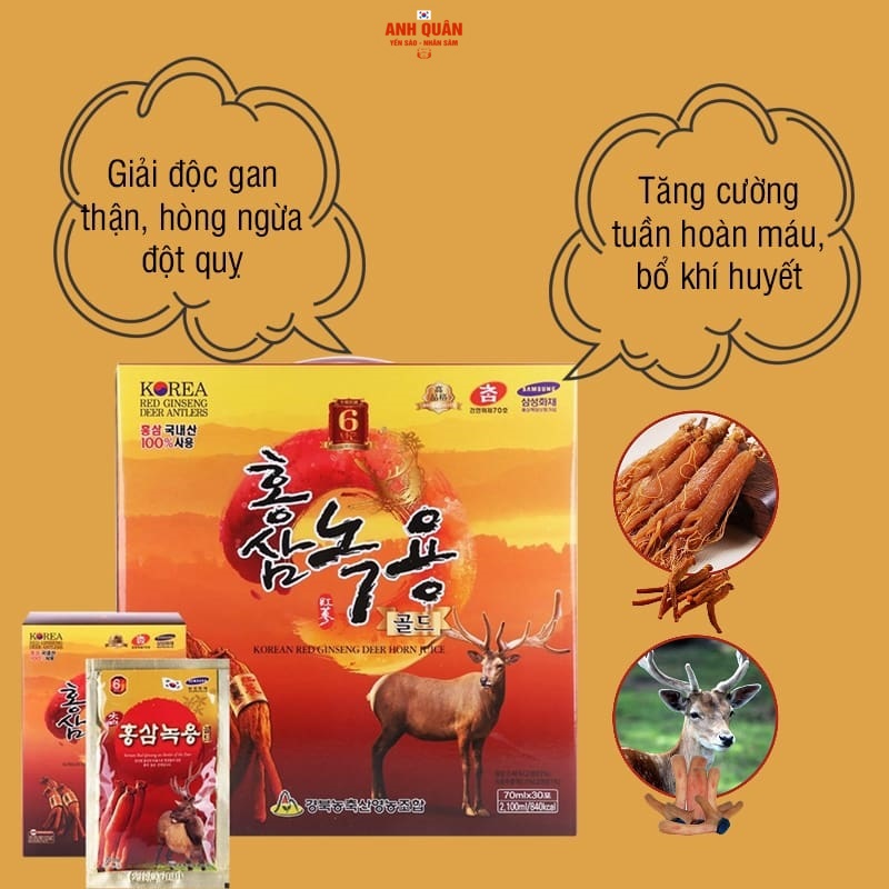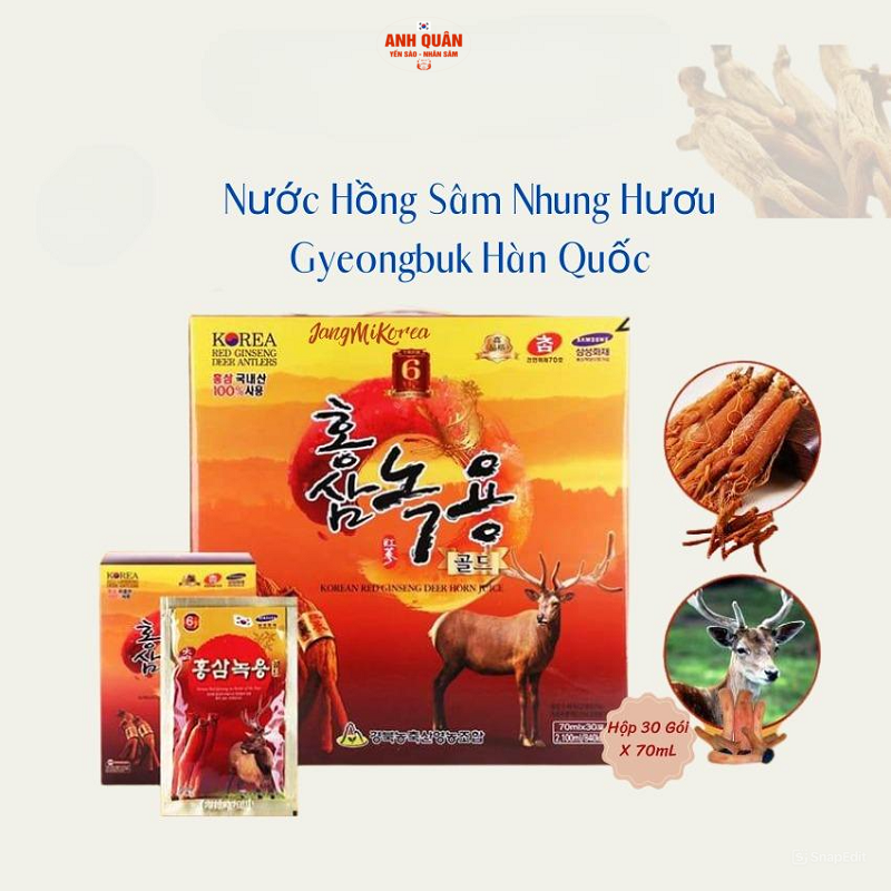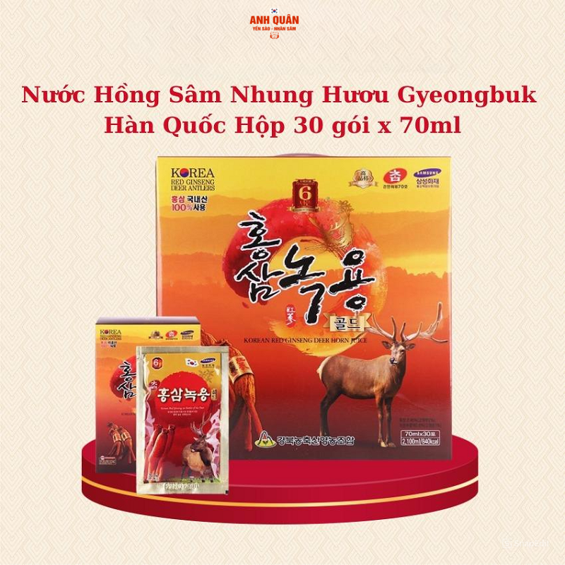 ⭐️ Nước Tinh Chất Hồng Sâm Nhung Hươu Gyeongbuk Nongchugsan Hàn Quốc Hộp 30 Gói x 70ml được chiết xuất từ hồng sâm 6 năm tuổi hàn quốc, nhung hươu, táo đỏ và sâm Angelica cùng một số dưỡng chất thiết yếu khác an toàn mà tốt cho sức khỏe. Nước hồng sâm nhung hươu Hàn Quốc dạng gói giúp hỗ trợ tăng cường sức đề kháng thích hợp dùng cho những người cơ thể ốm yếu, suy nhược, kén ăn mất ngủ.