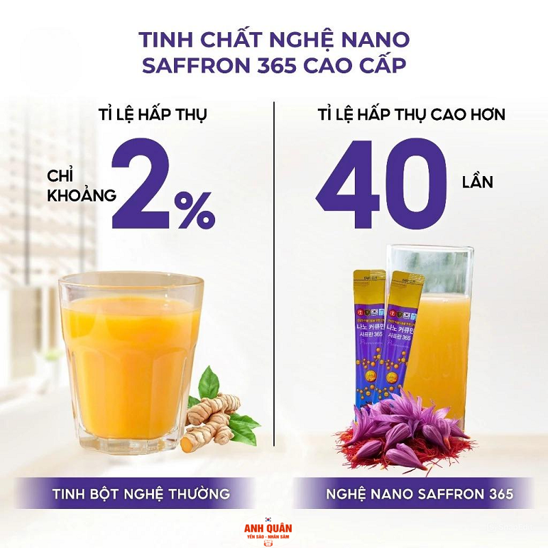 ✅ Nước Tinh Chất Nghệ Saffron 365 Nano Curcumin Nhụy Hoa Nghệ Tây Hộp 30 Sticks x 20ml là sản phẩm được nhà sản xuất sử dụng công nghệ Nano để chắt lọc siêu tinh chất Curcumin từ nghệ tươi, kết hợp chiết xuất từ nhụy hoa nghệ tây saffron, giúp các tế bào trong cơ thể tăng cường độ hấp thu Nano Curcumin lên gấp nhiều lần một cách dễ dàng. Với hàm lượng curcumin cao, sản phẩm có tác dụng hỗ trợ làm lành vết loét nhanh hơn, kháng viêm và bài trừ một số vi khuẩn trực tiếp gây viêm loét dạ dày, cho vóc dáng săn chắc và làn da đẹp. Sản phẩm đã được nghiên cứu gần 20 năm tại Hàn Quốc để cho ra đời một công thức đặc biệt để sử dụng củ nghệ tươi bằng phương pháp khác biệt, kết hợp với nhụy hoa nghệ tây safron, nhằm phát huy tối đa các ưu điểm so với tinh bột nghệ truyền thống.