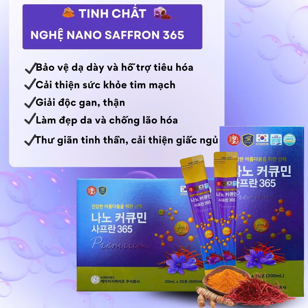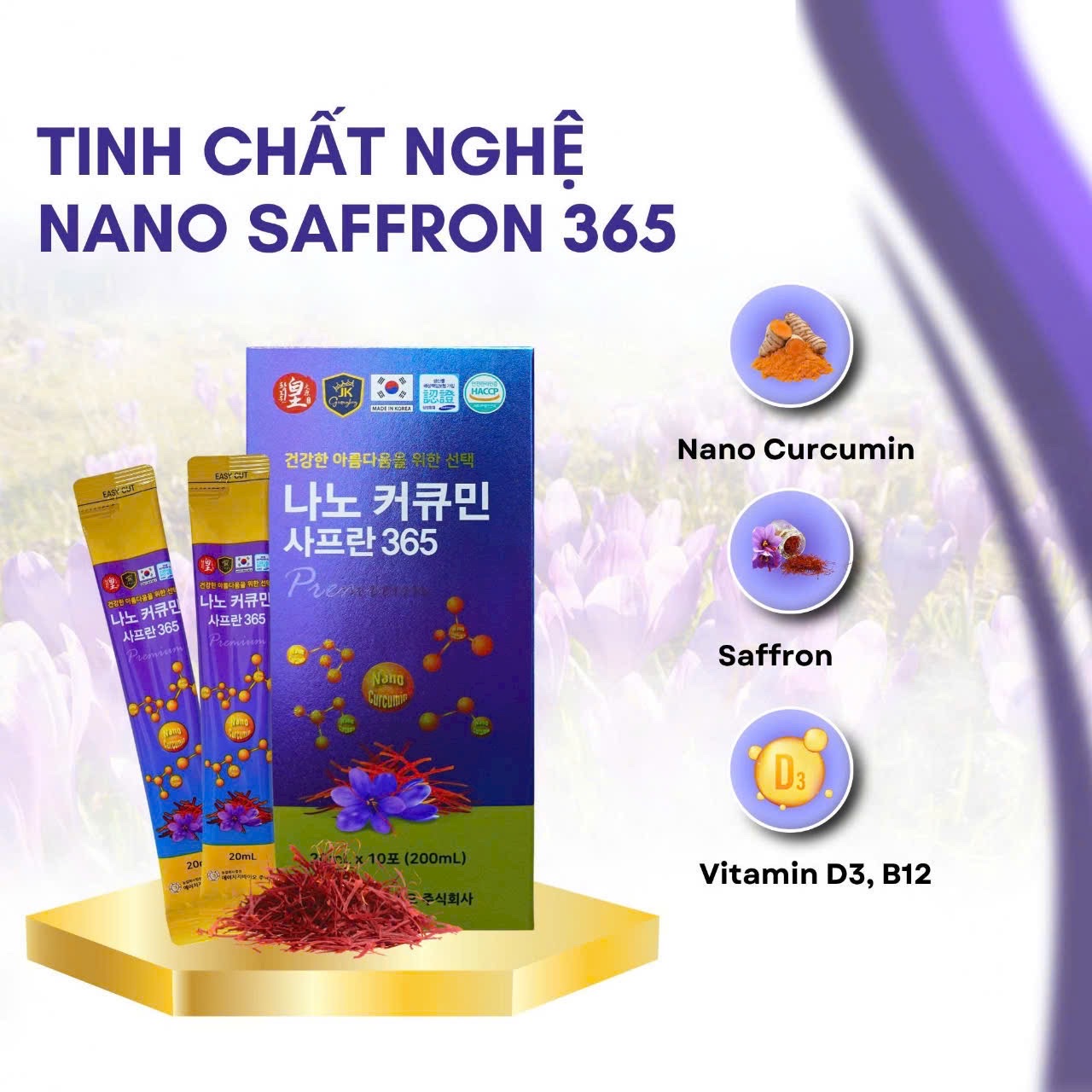 ✅ Nước Tinh Chất Nghệ Saffron 365 Nano Curcumin Nhụy Hoa Nghệ Tây Hộp 30 Sticks x 20ml là sản phẩm được nhà sản xuất sử dụng công nghệ Nano để chắt lọc siêu tinh chất Curcumin từ nghệ tươi, kết hợp chiết xuất từ nhụy hoa nghệ tây saffron, giúp các tế bào trong cơ thể tăng cường độ hấp thu Nano Curcumin lên gấp nhiều lần một cách dễ dàng. Với hàm lượng curcumin cao, sản phẩm có tác dụng hỗ trợ làm lành vết loét nhanh hơn, kháng viêm và bài trừ một số vi khuẩn trực tiếp gây viêm loét dạ dày, cho vóc dáng săn chắc và làn da đẹp. Sản phẩm đã được nghiên cứu gần 20 năm tại Hàn Quốc để cho ra đời một công thức đặc biệt để sử dụng củ nghệ tươi bằng phương pháp khác biệt, kết hợp với nhụy hoa nghệ tây safron, nhằm phát huy tối đa các ưu điểm so với tinh bột nghệ truyền thống.