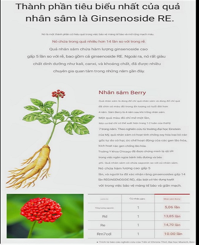 ⭐ Quả nhân sâm có hàm lượng Saponin cao gấp 5 lần củ nhân sâm. Đặc biệt, hàm lượng Ginsengoside Re trong quả nhân sâm cao gấp 14 lần củ nhân sâm. Quả nhân sâm có hoạt tính chống oxi hoá cao, giúp loại bỏ các gốc tự do có hại, kích hoạt các gen chống lão hoá. Có tác dụng bảo vệ màng tế bào và giãn mạch. Ngoài ra, quả nhân sâm rất giàu chất dinh dưỡng như kali, canxi và khoáng chất… rất tốt cho cơ thể người sử dụng.