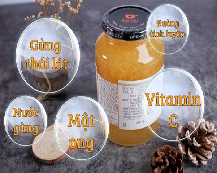 ✅ Thành phần nguyên liệu sản phẩm: Mật ong nguyên chất (nội địa Hàn Quốc) 5%, gừng tươi thái sợi (nội địa Hàn Quốc) 22%, nước chiết xuất tinh chất gừng tươi 5.29%, axit xitric khan (chất bảo quản tự nhiên), natri citrate, chế phẩm hỗn hợp carrageenan, đường fructose, nước tinh khiết, đường glucose, calcium lactate, vitamin C…