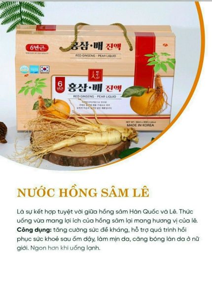 Nước Chiết Xuất Hồng Sâm Lê Hộp 30 Gói x 50ml (Red Ginseng Pear Liquid) là một loại nước uống giàu dinh dưỡng, được chiết xuất từ hồng sâm 6 năm tuổi kết hợp cùng với nước ép trái lê tươi ngon, thanh mát. Sản phẩm được dùng để bồi bổ sức khỏe, tăng cường thể chất, cung cấp vitamin làm đẹp da, hỗ trợ làm chậm lão hóa các bộ phận trên cơ thể người sử dụng.